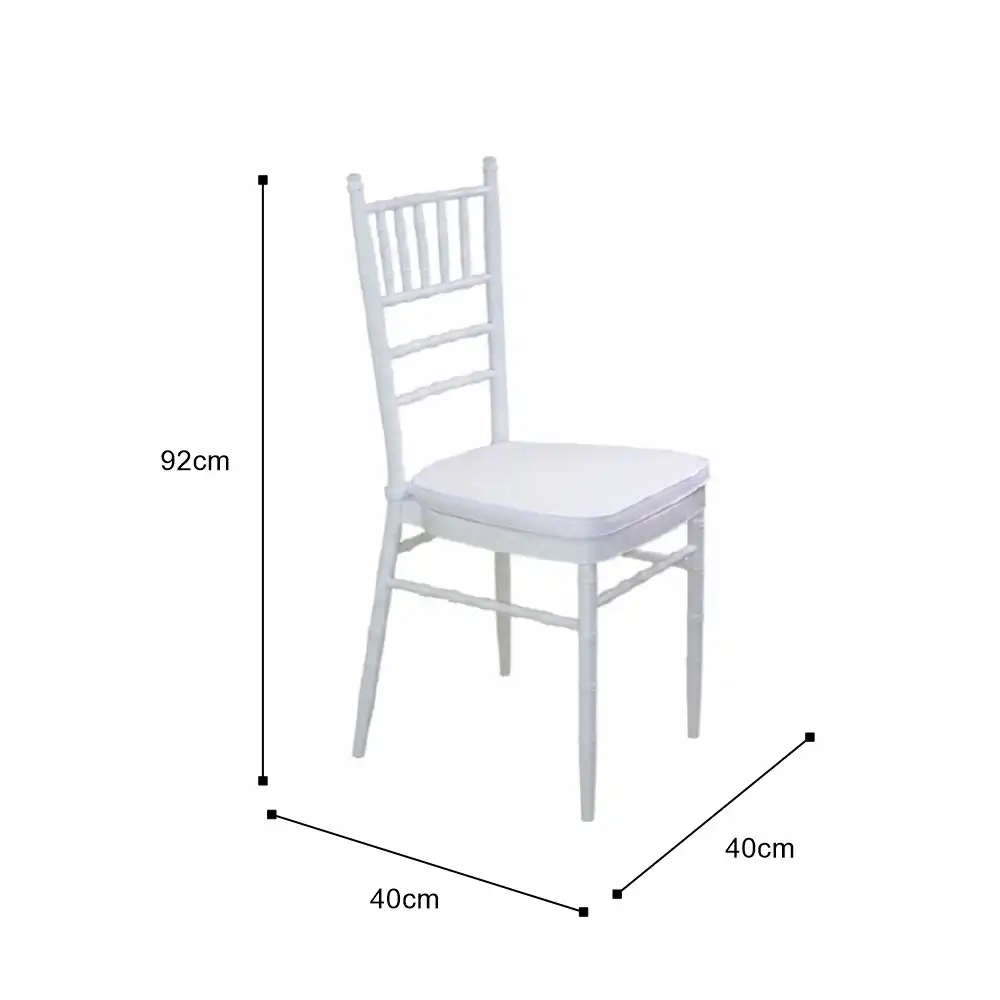 The Tiffany White Chair brings a clean, romantic look to indoor and outdoor ceremonies, garden receptions, and ballroom dinners. It pairs easily with any colour scheme, from soft pastels to bold jewel tones, and photographs beautifully along aisles and at dining tables.